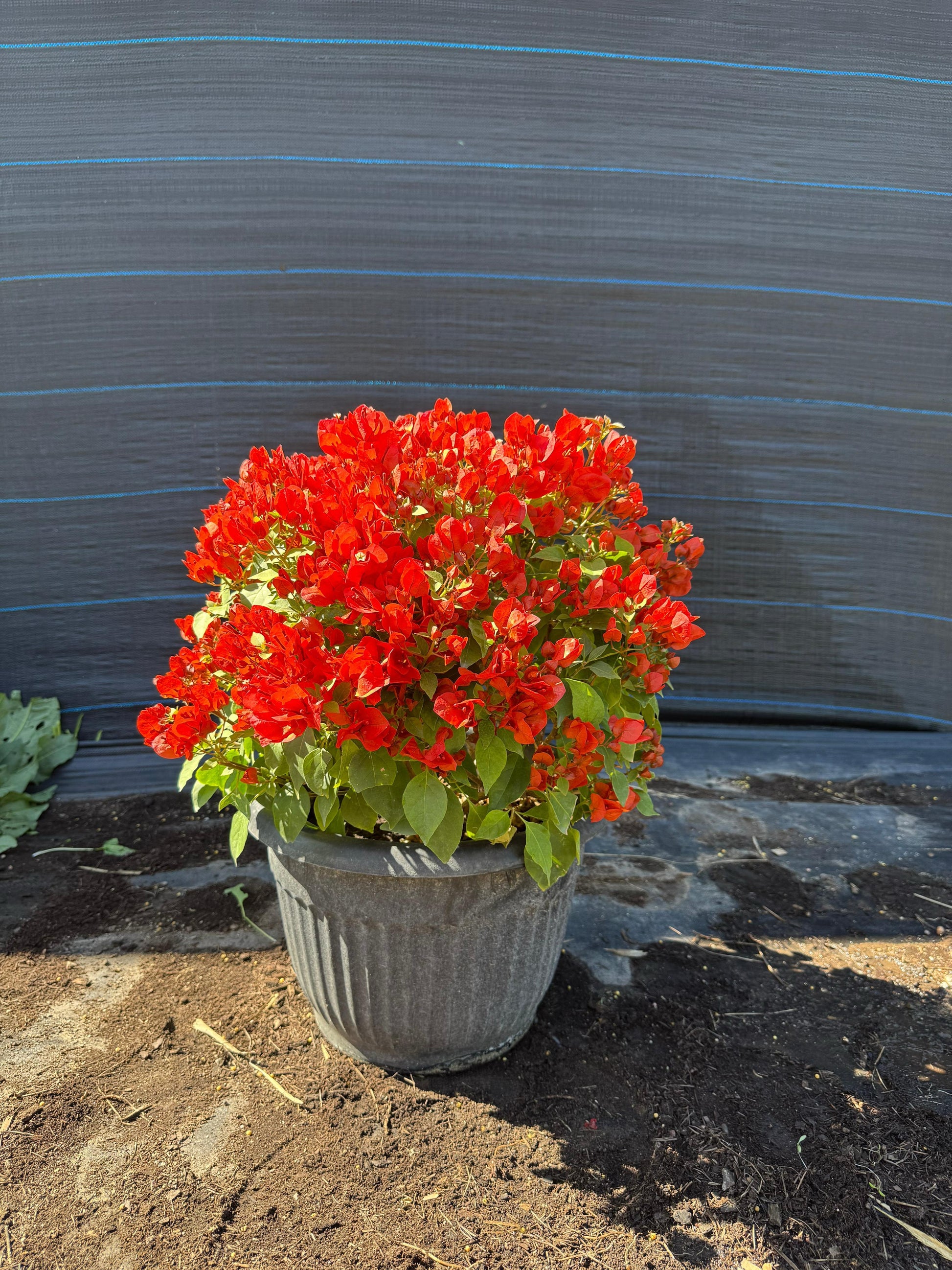 La bugambilia roja en bolo es un estallido de color concentrado y elegante. Sus brácteas encendidas, que parecen flores de fuego, iluminan terrazas, balcones y patios con una intensidad única, evocando el encanto mediterráneo.