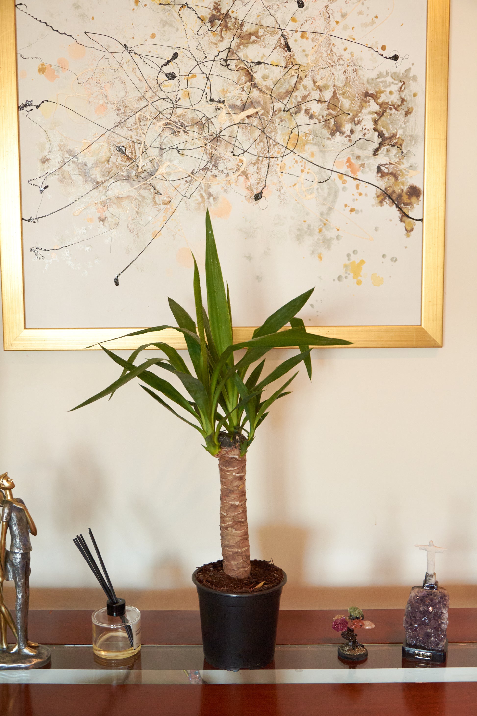 La Yuca conserva toda la fuerza estética de la especie en un formato compacto. Ideal para repisas, muebles bajos o rincones con buena luz donde quieras sumar diseño sin saturar. Su follaje alargado y ligeramente arqueado aporta verticalidad con una huella visual limpia y moderna.