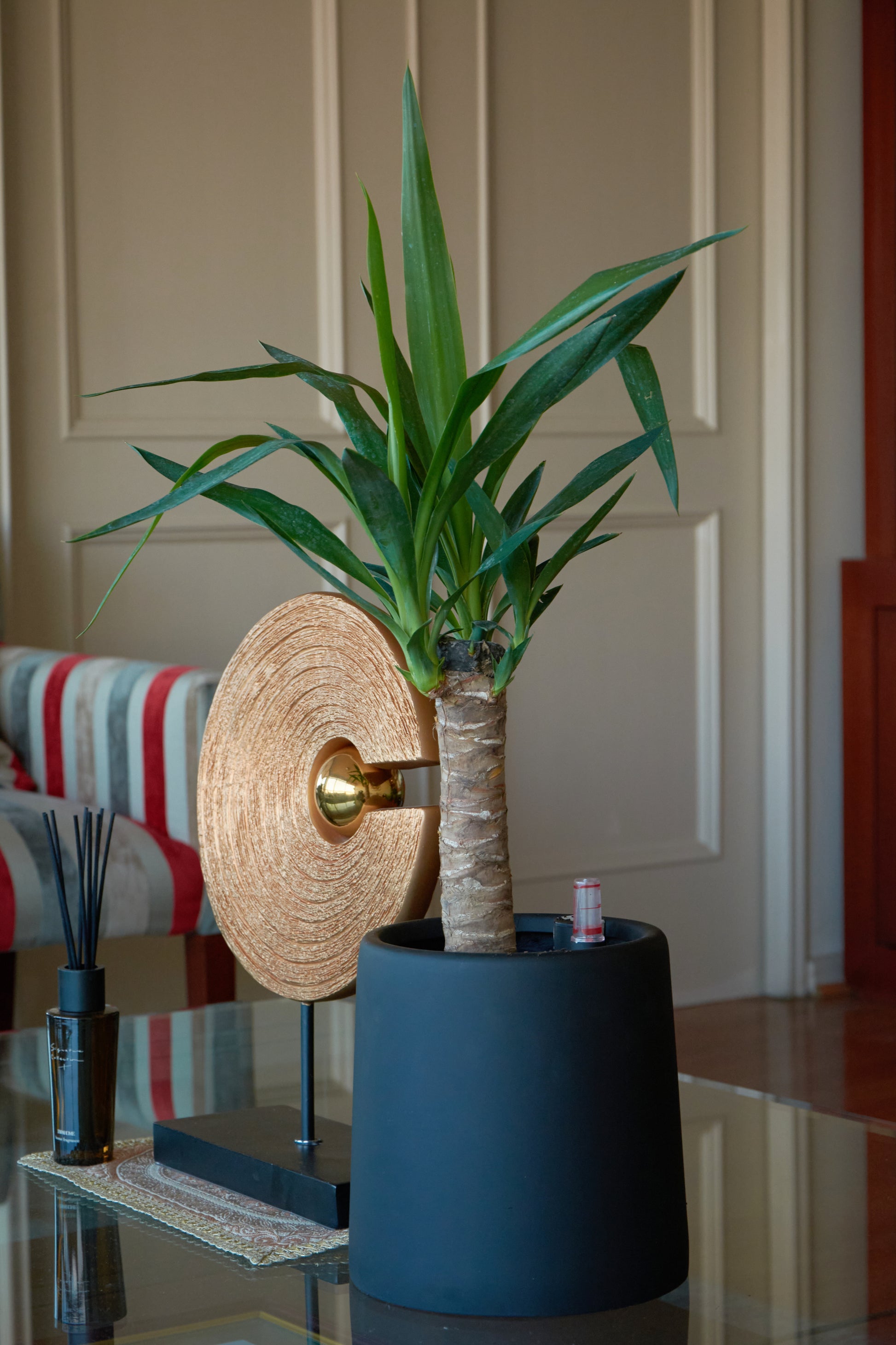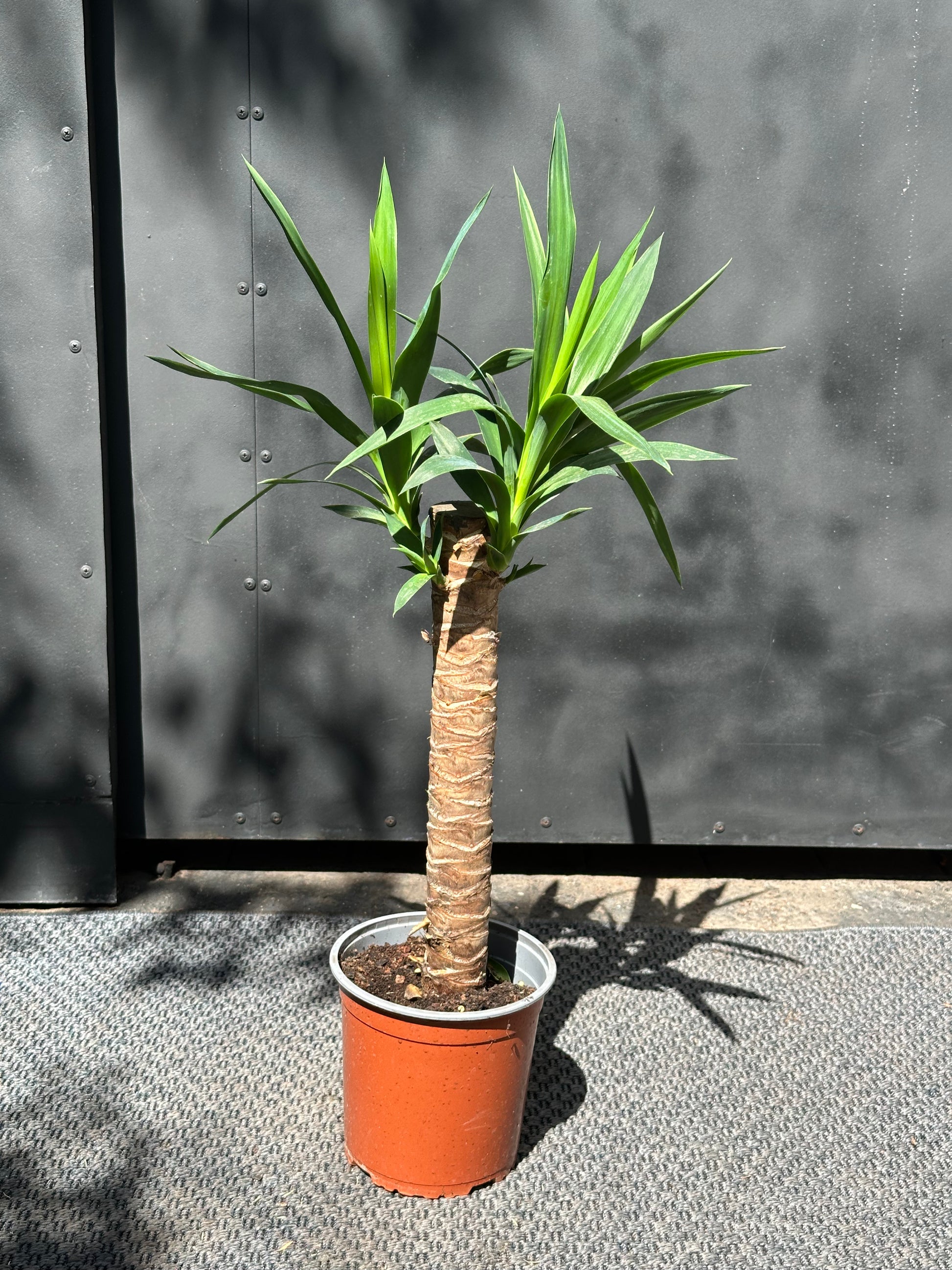 Esta Yuca no solo es bella, es práctica. Se desarrolla bien con luz natural intensa o sol parcial, y agradece ambientes con buena circulación de aire. Es importante evitar el exceso de riego: deja que el sustrato se seque completamente antes de volver a regar.